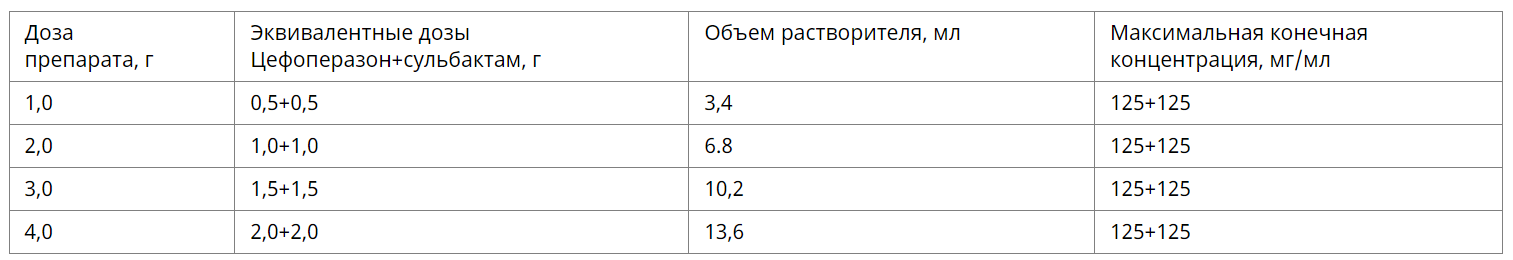Внутримышечное введение. Для приготовления раствора для в/м введения используют воду для инъекций (см. таблицу) или 2 % раствор лидокаина. 2 % раствор лидокаина нельзя применять для первоначального разведения цефоперазона+сульбактама. учитывая их фармацевтическую несовместимость. Совместимости можно добиться путем 2-х этапного приготовления раствора.