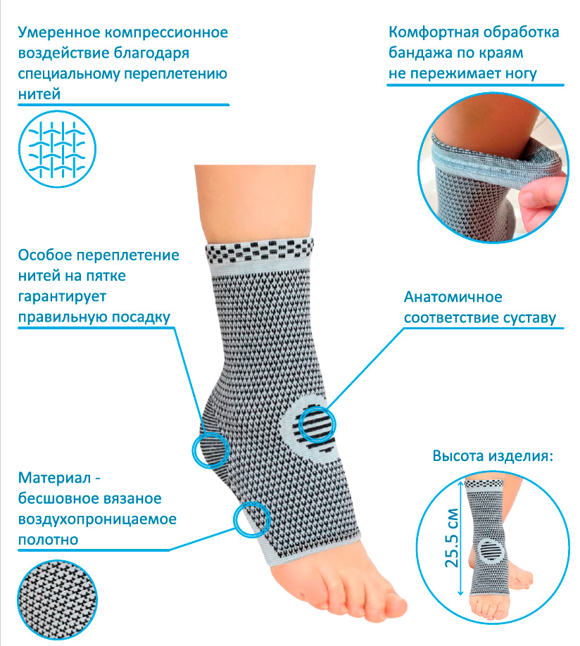 • Специальное плетение волокон обеспечивает анатомичное соответствие суставу, плотную фиксацию и необходимую компрессию области голеностопного сустава
