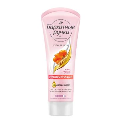 Бархатные ручки крем для рук регенерирующий - это высококачественный продукт, предназначенный для увлажнения и ухода за кожей рук. Крем разработан специально для кожи рук, требующей особо интенсивного ухода. Компоненты в составе крема активируют восстановление клеток, обеспечивая профилактику появления мелких трещинок.