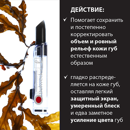 Экстракт бурых водорослей (семейство Dictyoptales) - обладает уникальной способностью стимулировать жировые клетки (адипоциты). Увеличиваясь в размере, они плавно и естественно увеличивают объем и упругость губ, разглаживают неровности, возвращают губам более молодой вид.