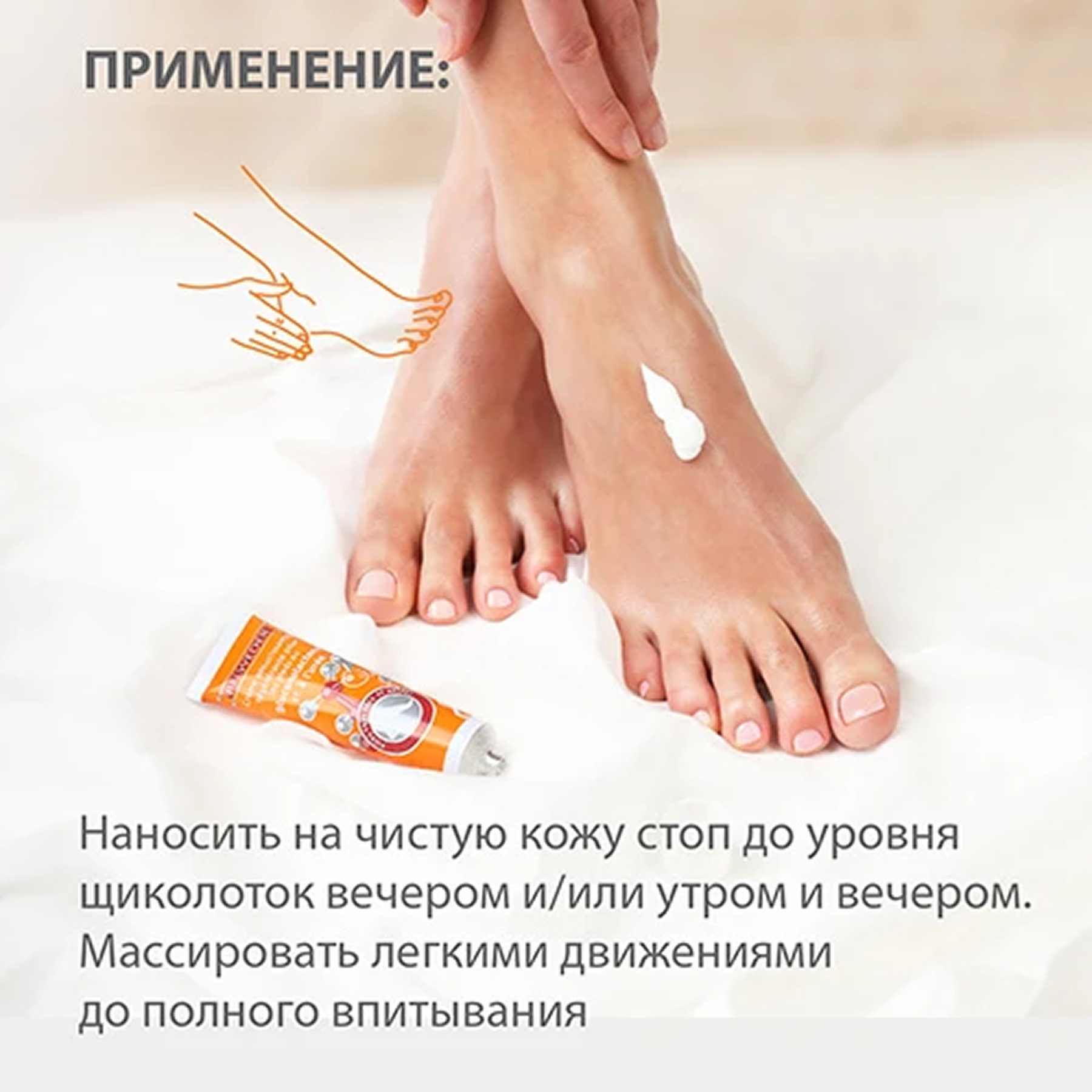Наносить на чистую кожу стоп до уровня щиколоток вечером и/или утром и вечером. Массировать легкими движениями до полного впитывания