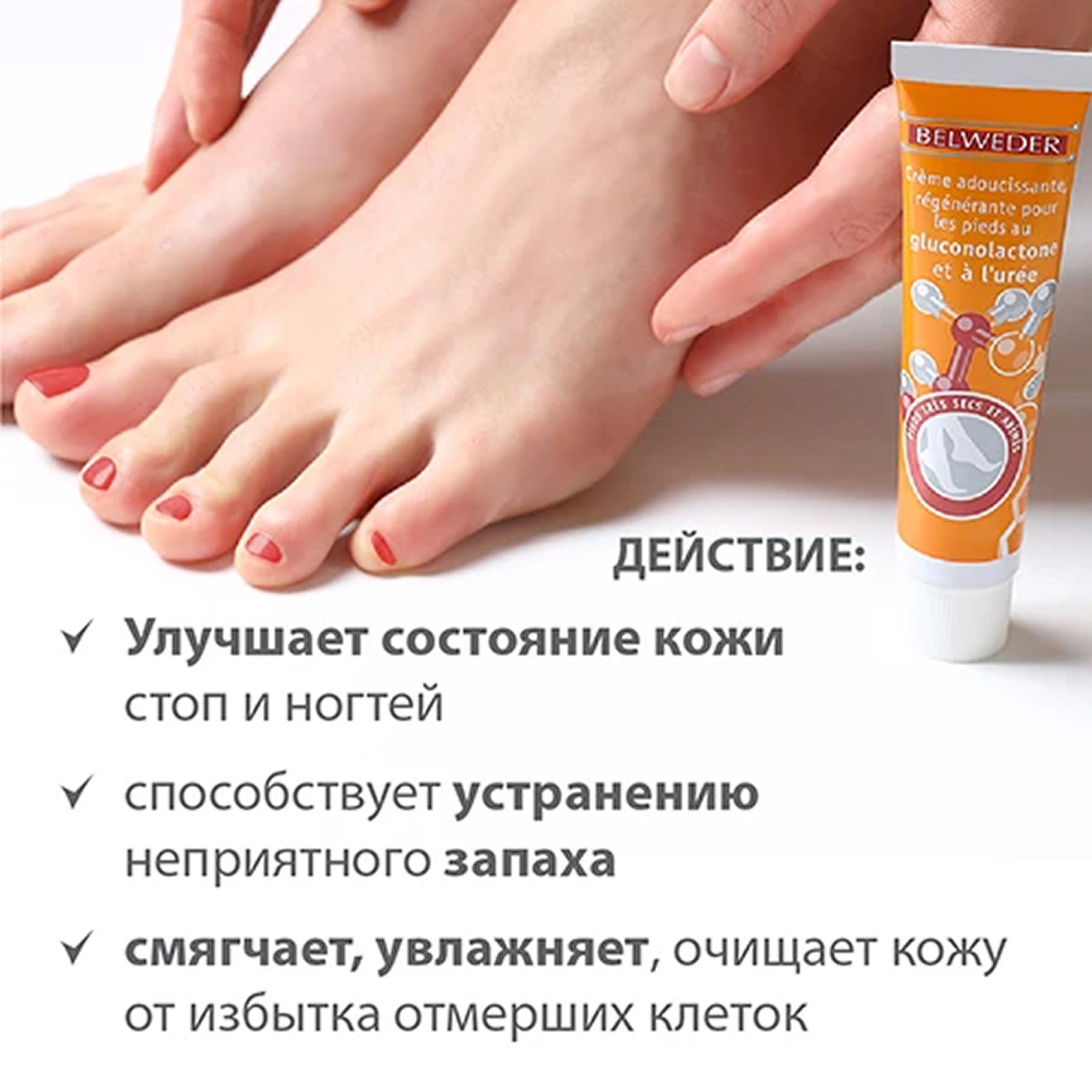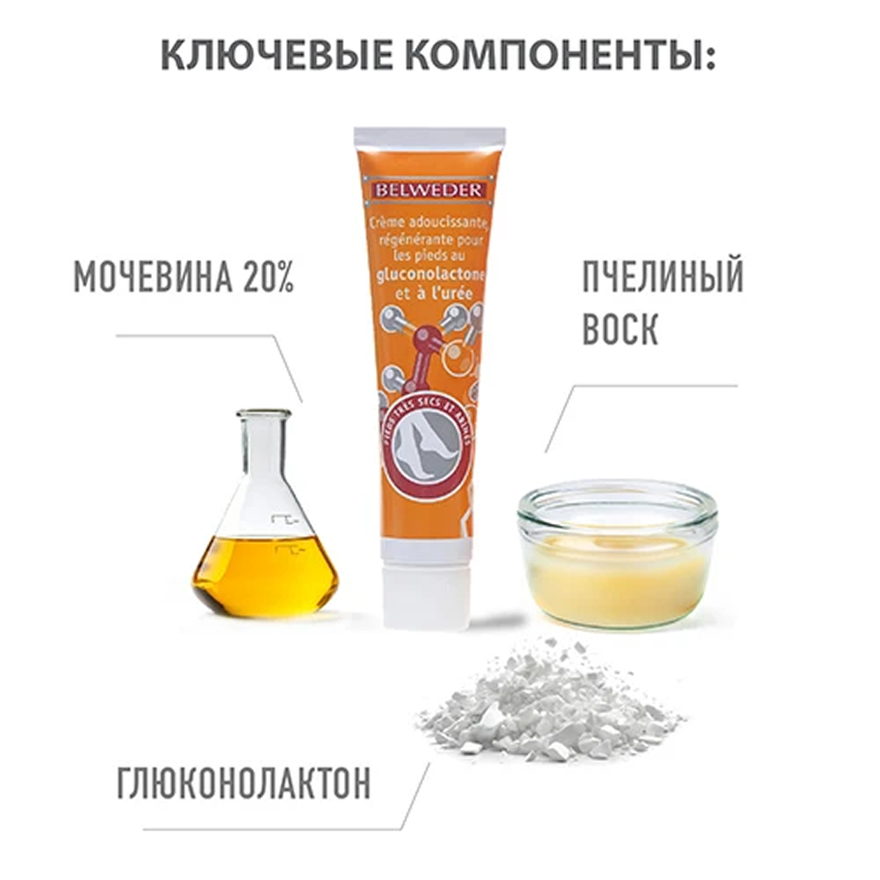 Мочевина(20%) - увлажняет кожу, устраняет дискомфорт и зуд, вызванный сухостью; улучшает проницаемость рогового слоя; стимулирует обновление клеток кожи, способствует более быстрой регенерации, препятствует и/или устраняет проявления воспаления; ускоряет заживление небольших повреждений, трещинок, потертостей; в концентрации 20% оказывает антибактериальное действие, препятствует размножению микроорганизмов, что, в свою очередь, препятствует появлению неприятного запаха