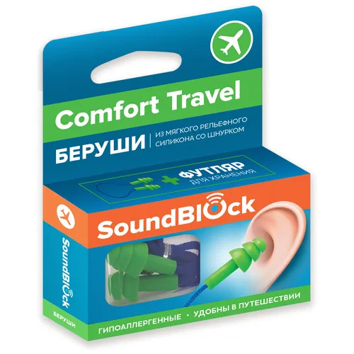 Анатомические беруши для сна SoundBlock Comfort Travel надежно защищают вас от шума в 28дБ. Такой уровень шумоподавления гарантирует вам, что в путешествии вы не будете слышать турбины самолета или же раздражающие скрипы кресел соседей.