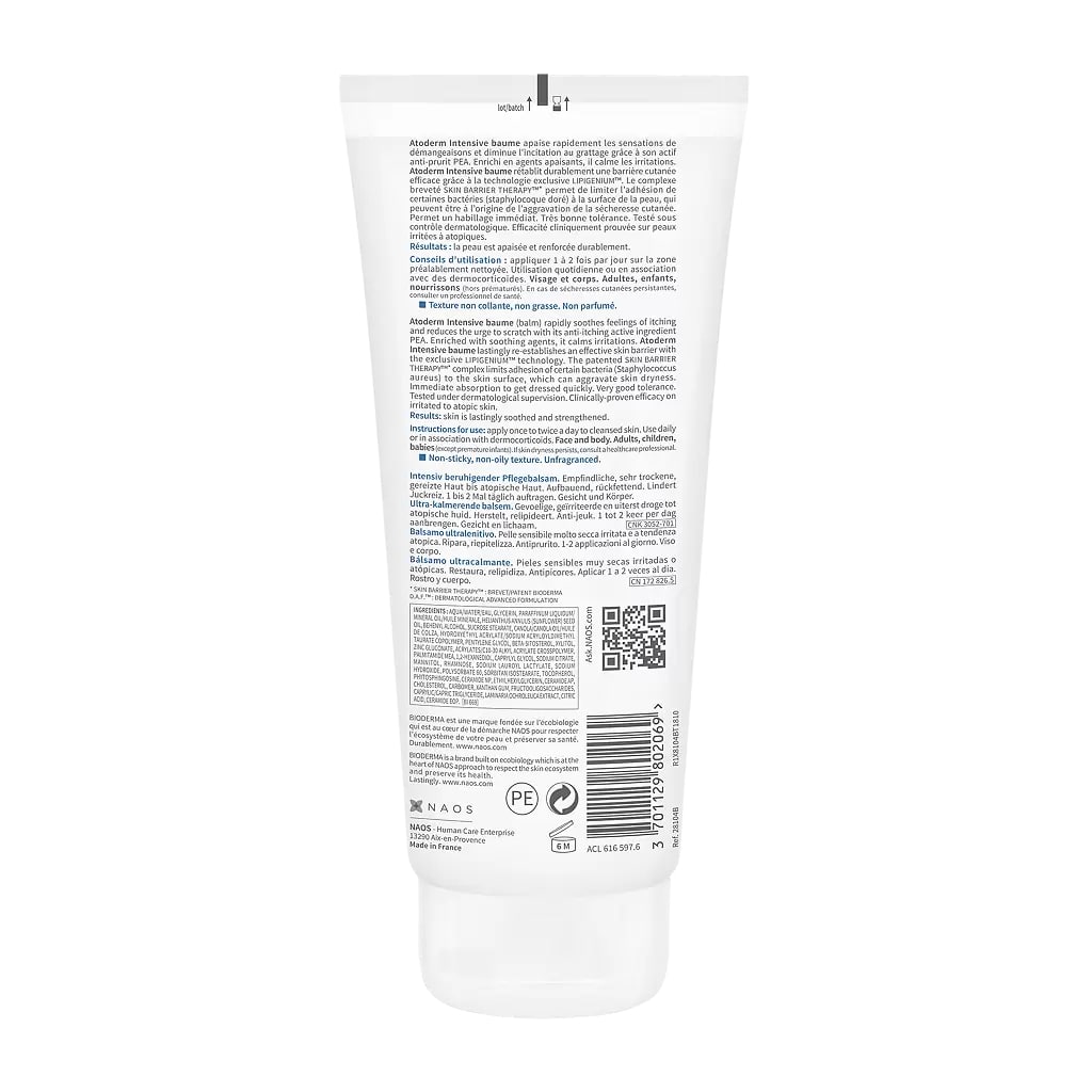 Bioderma Atoderm Intensive Baume помогает снять симптомы, сопровождающие сухую, очень сухую и атопичную кожу. А также успокоить ее, увлажнить и повысить сопротивляемость агрессивным факторам. Бальзам быстро устраняет симптомы зуда и помогает справиться с расчесами. У 76 % людей, которые используют этот продукт, после шести месяцев пропадают неприятные симптомы. Бальзам Интенсив также качественно и надолго увлажняет кожу. Его действия хватает на 24 часа.