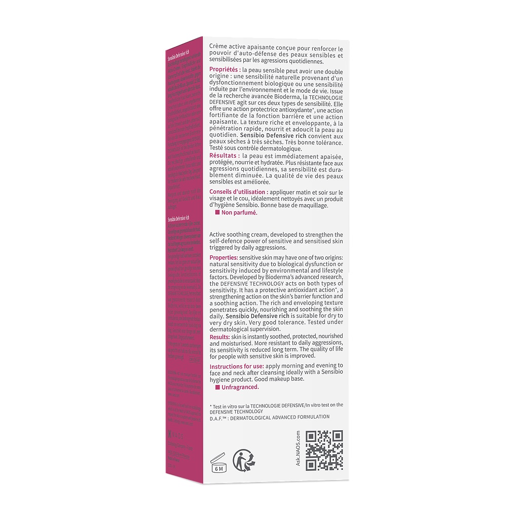 Покалывание, ощущение жжения и стянутости, зуд - подобные признаки чувствительности кожи испытывает более 60% населения планеты. Помимо природного нарушения биологической функции кожи жители городов сталкиваются с приобретенной чувствительностью вследствие влияния агрессивных факторов среды. Крем Биодерма Сенсибио Дефенсив поможет в решении проблемы чувствительности, светочувствительности кожи и их комбинации независимо от причины появления. Средство за 30 секунд устраняет покалывание и надолго успокаивает кожу, восстанавливает комфорт. Технология Défensive нацелена на усиление природных защитных функций эпидермиса, в перспективе укрепляет механизм самозащиты от агрессивных факторов среды. Крем с насыщенной обволакивающей текстурой питает и смягчает кожу, обладает высокой переносимостью, протестирован под дерматологическим контролем. Отличная база под макияж.