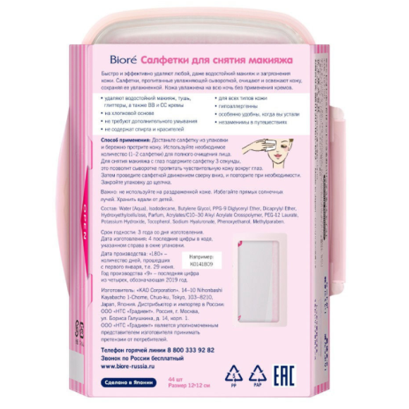 Принцип Biore - уход за кожей через регулярное, тщательное очищение без стресса. В основе каждого продукта Biore - уникальная запатентованная технология Skin Purifying Technology (SPT). SPT имеет высочайшие показатели по удалению загрязнений с кожи. ПАВы не проникают в кожу, тем самым нормализуя естественные функции, делая ее здоровой и ухоженной при регулярном использовании. BIORE САЛФЕТКИ ДЛЯ СНЯТИЯ МАКИЯЖА - для всех типов кожи, подходят для чувствительной кожи.