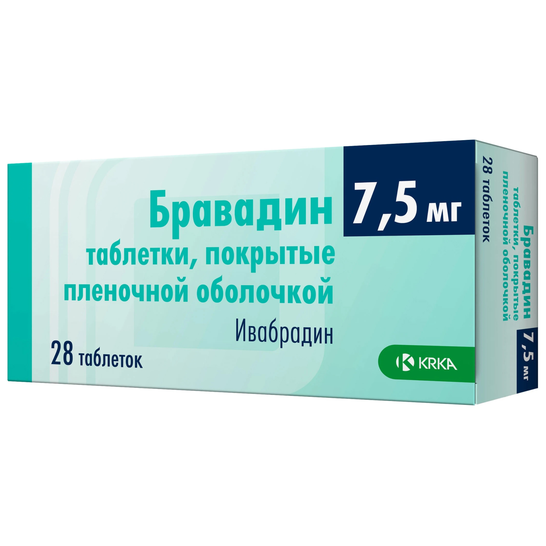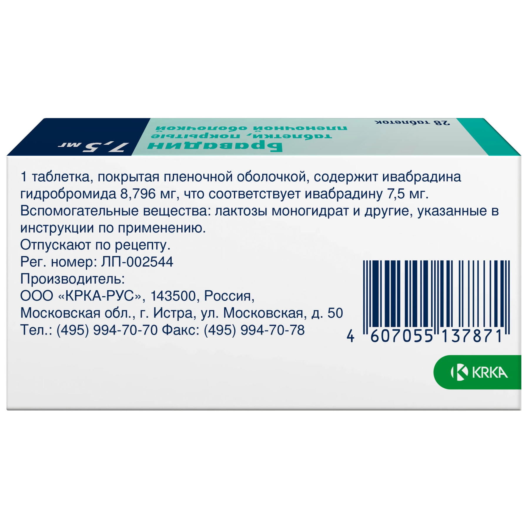 Действующее вещество: Ивабрадина гидробромид 8,796 мг, что соответствует ивабрадину 7,5 мг