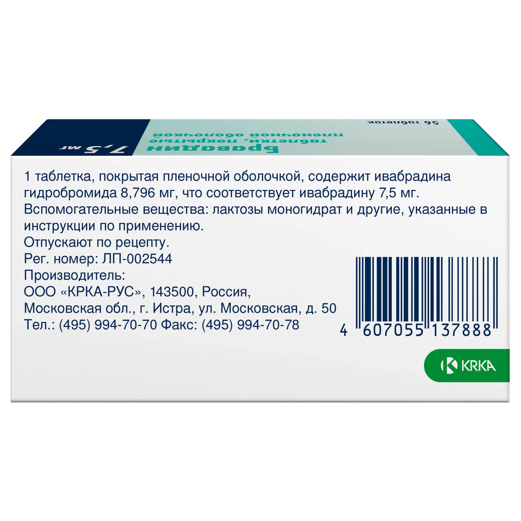 T1/2 ивабрадина составляет 2 ч (70-75% AUC) и эффективный T1/2 составляет 11 ч. Общий клиренс составляет примерно 400 мл/мин, почечный - около 70 мл/мин. Экскреция метаболитов происходит с одинаковой скоростью с мочой и калом. Около 4% принятой внутрь дозы выводится с мочой в неизменном виде.