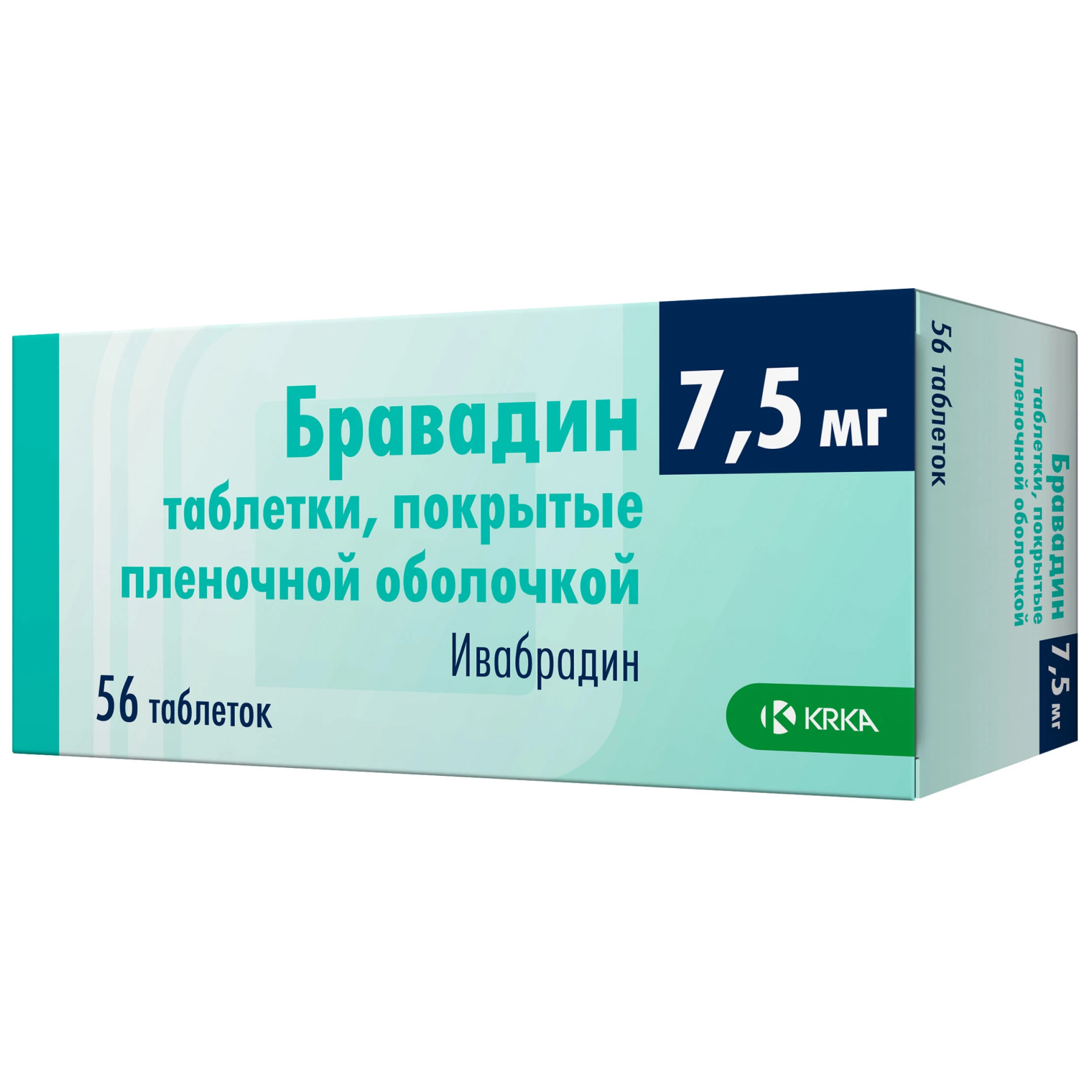 Через 3-4 недели терапии доза может быть увеличена до 15 мг в сутки (по 1 таблетке 7,5 мг два раза в сутки) в зависимости от терапевтического эффекта. Если во время применения препарата Бравадин ЧСС в покое урежается менее 50 уд/мин, или у пациента возникают симптомы, связанные с брадикардией (головокружение, повышенная утомляемость или выраженное снижение АД), дозу препарата Бравадин® необходимо уменьшить до 2,5 мг (по таблетки 5 мг) два раза в сутки.