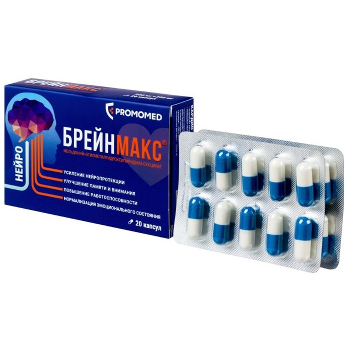 Применение комплекса триметилгидразиния пропионата и этилметилгидроксипиридина сукцината приводит к синергическому фармакодинамическому взаимодействию двух компонентов по типу конформационно-селективного агонизма к рецепторам, что повышает нейропротекторную активность препарата. В условиях гипоксии препарат БРЕЙНМАКС® приводит к активации выработки энергии в митохондриях, а в условиях снижения кровоснабжения способствует сохранению структуры и жизнедеятельности клеток, в частности нейронов и кардиомиоцитов.