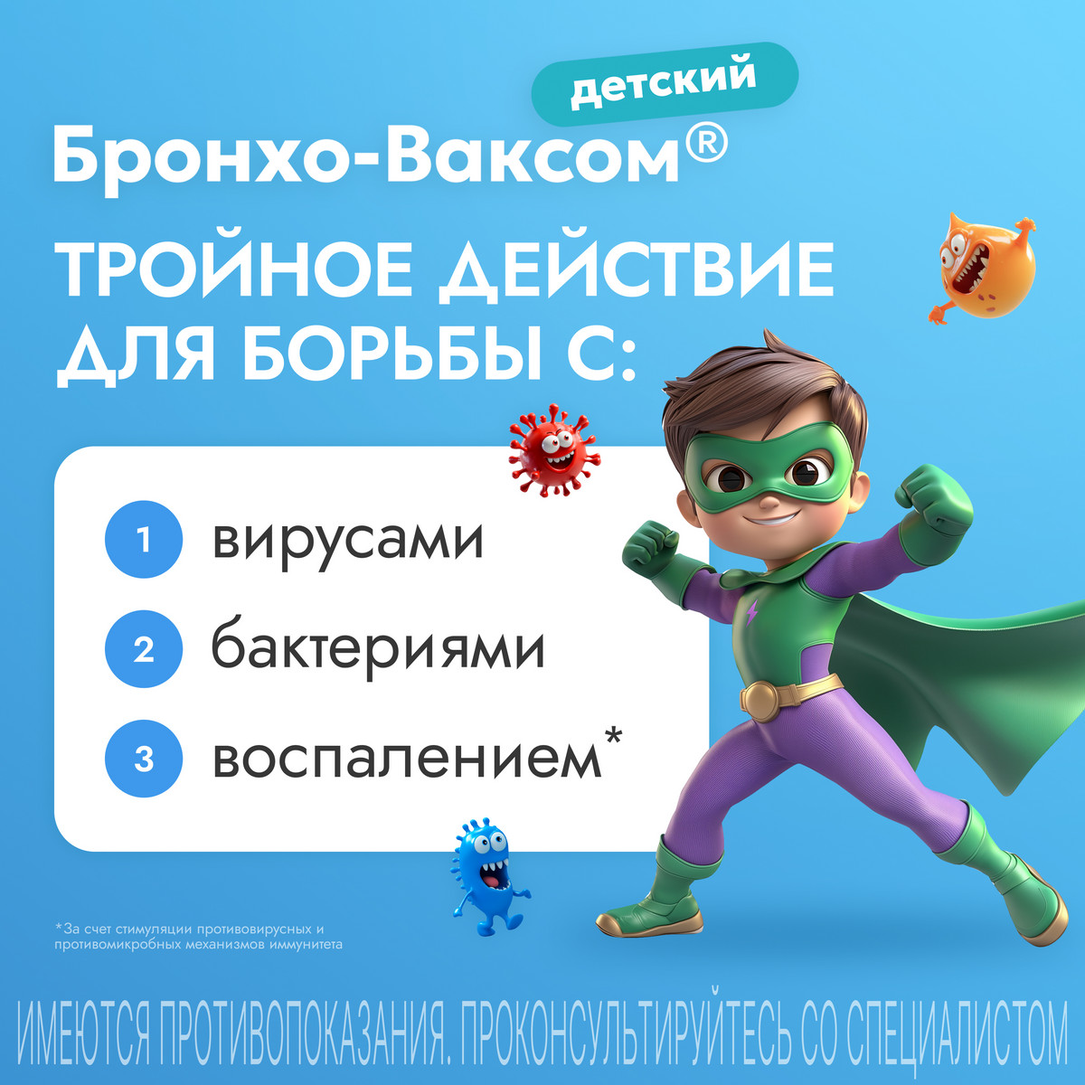 Клинически Бронхо-Ваксом® детский уменьшает частоту острых инфекций дыхательных путей, сокращает продолжительность их течения, снижает вероятность обострения хронического бронхита, а также повышает устойчивость организма к инфекциям дыхательной системы. При этом снижается потребность применения других лекарственных препаратов, особенно антибиотиков.