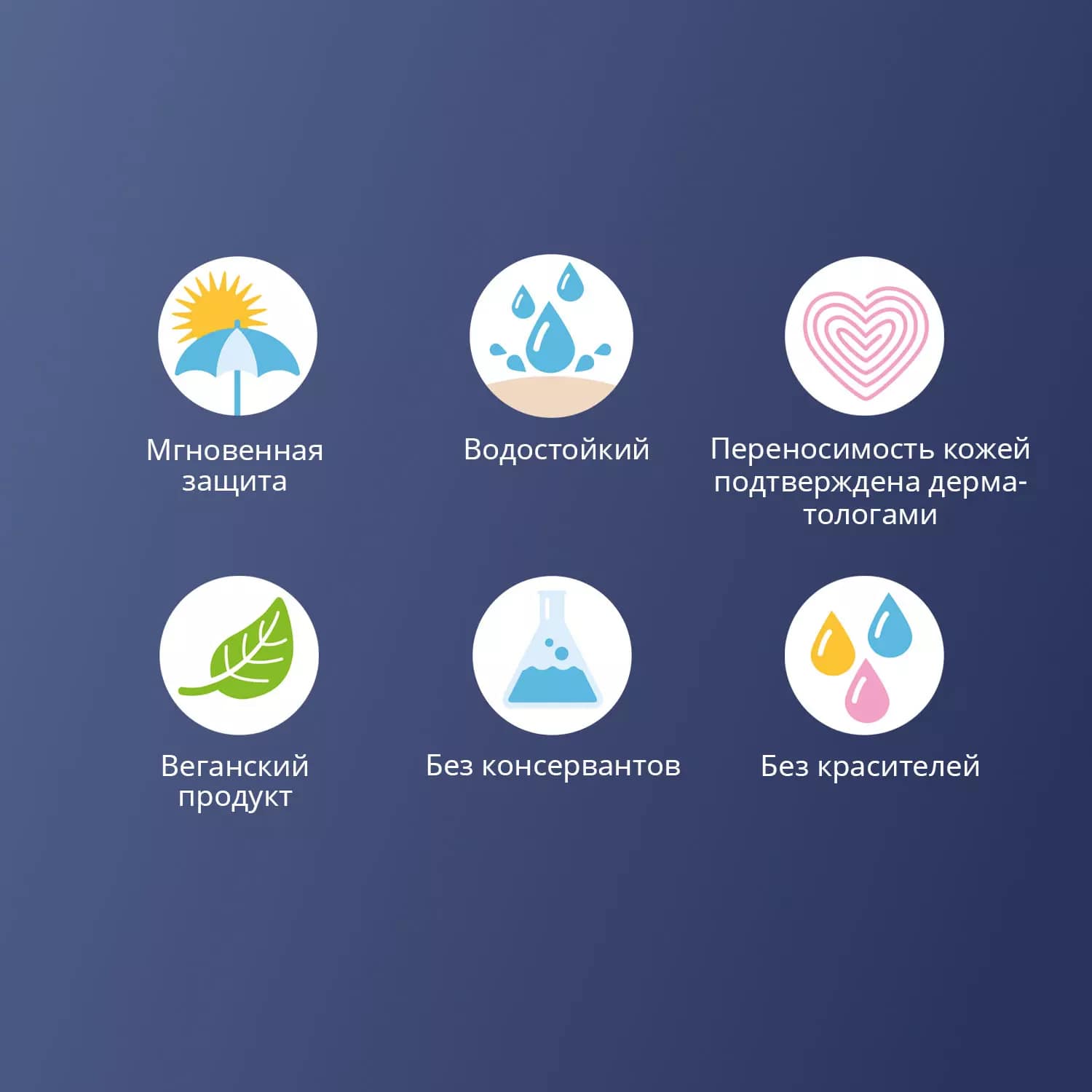 Для детей с 6 месяцев и для всей семьи. Водостойкий, веганский продукт. Без октокрилена, без минеральных масел, без красителей, без парабенов, без микропластика. рН нейтрально для кожи. Переносимость подтверждена дерматологами.