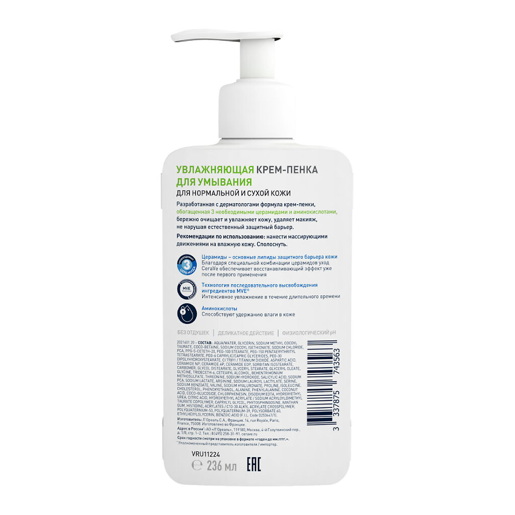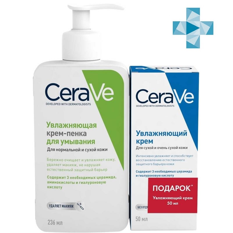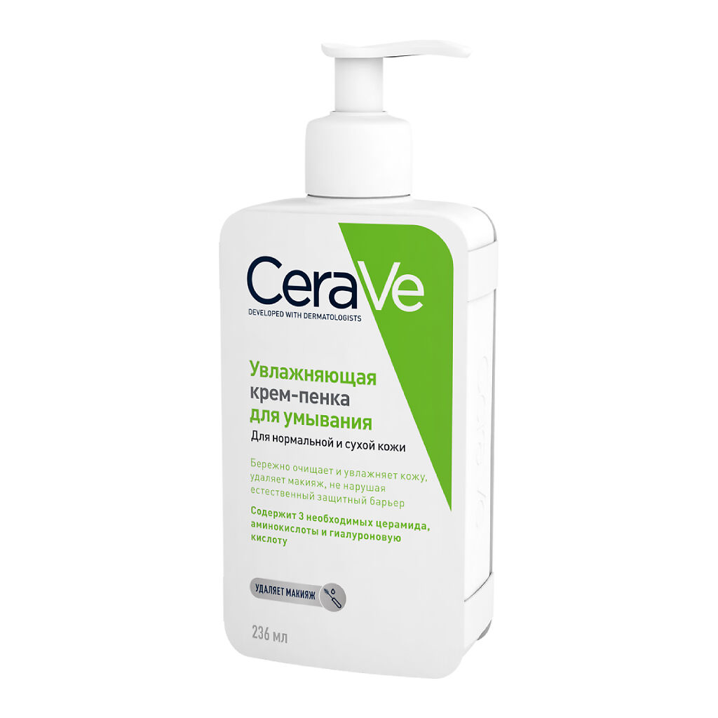 CeraVe® Увлажняющая крем-пенка для умывания разработанная с дерматологами формула крем-пенки, обогащенная тремя необходимыми церамидами и аминокислотами эффективно удаляет макияж, очищает и увлажняет кожу, не нарушая ее естественный защитный барьер.