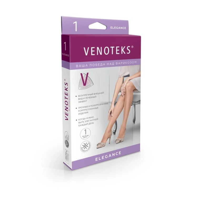 VENOTEKS ELEGANCE предотвращают усталость и тяжесть в ногах, снимают небольшие отёки и другие начальные проявления заболевания вен. Рекомендованы для профилактики и при начальных стадиях поражения вен на уровне подколенной ямки голени и/или стопы, в том числе у беременных женщин.