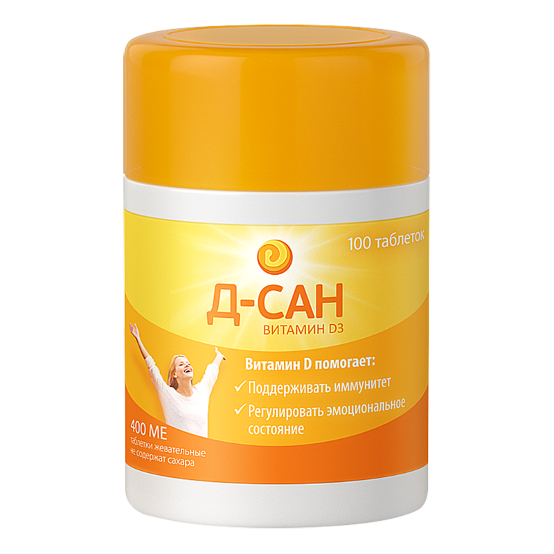1 таблетка продукта Д-Сан содержит рекомендуемую суточную дозу витамина D. Благодаря оптимально подобранной дозировке Д-Сан можно принимать в течение всего года.