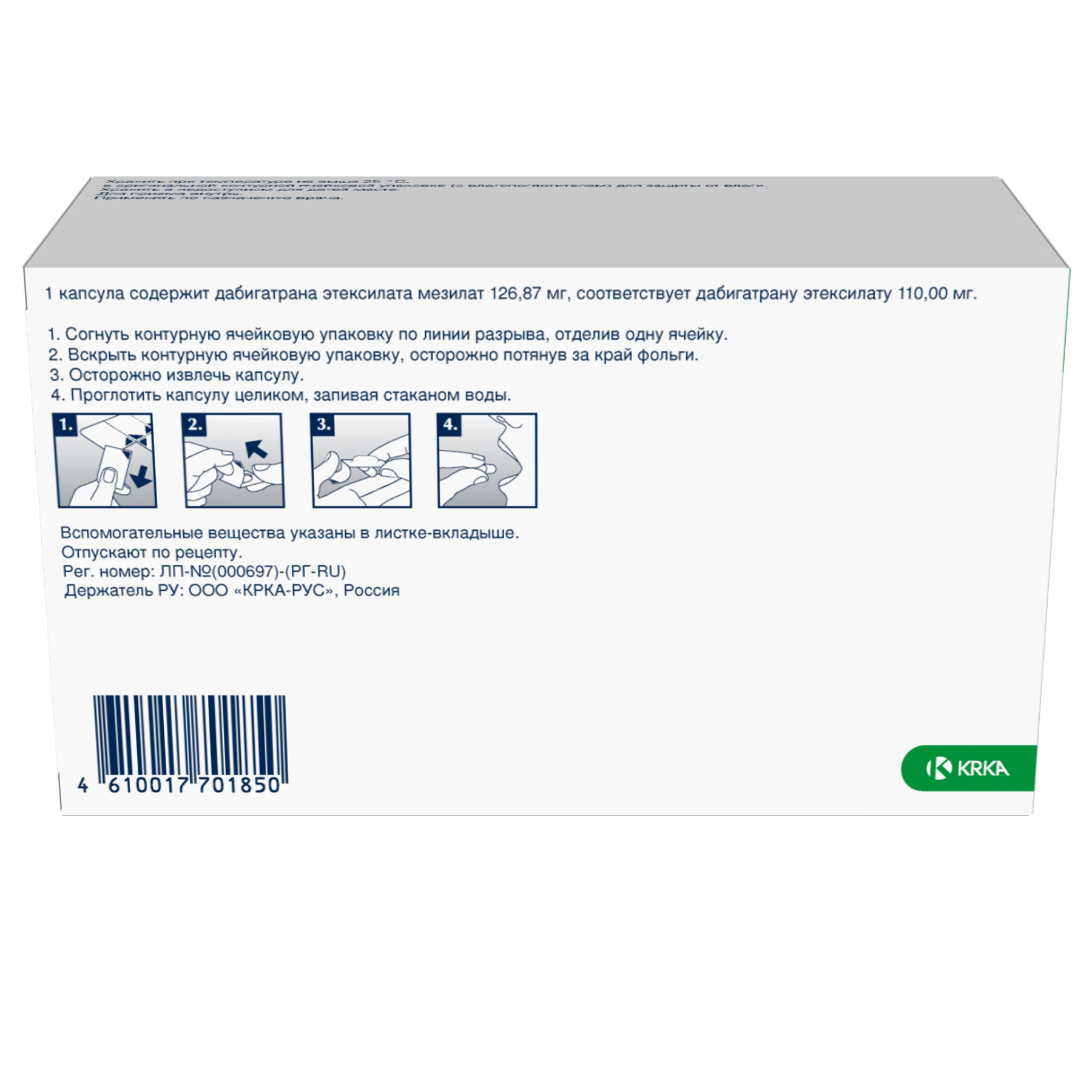 Действующее вещество : 110 мг дабигатрана этексилата, что соответствует 126,87 мг дабигатрана этексилата мезилата и 294,06 мг дабигатрана субстанции-пеллеты.