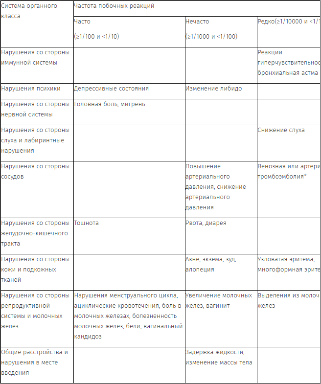 Следующие побочные реакции были зарегистрированы у женщин, применяющих КОК, с очень редкой частотой возникновения или с отсроченными симптомами, которые, как полагают, могут быть связаны с приемом КОК:
