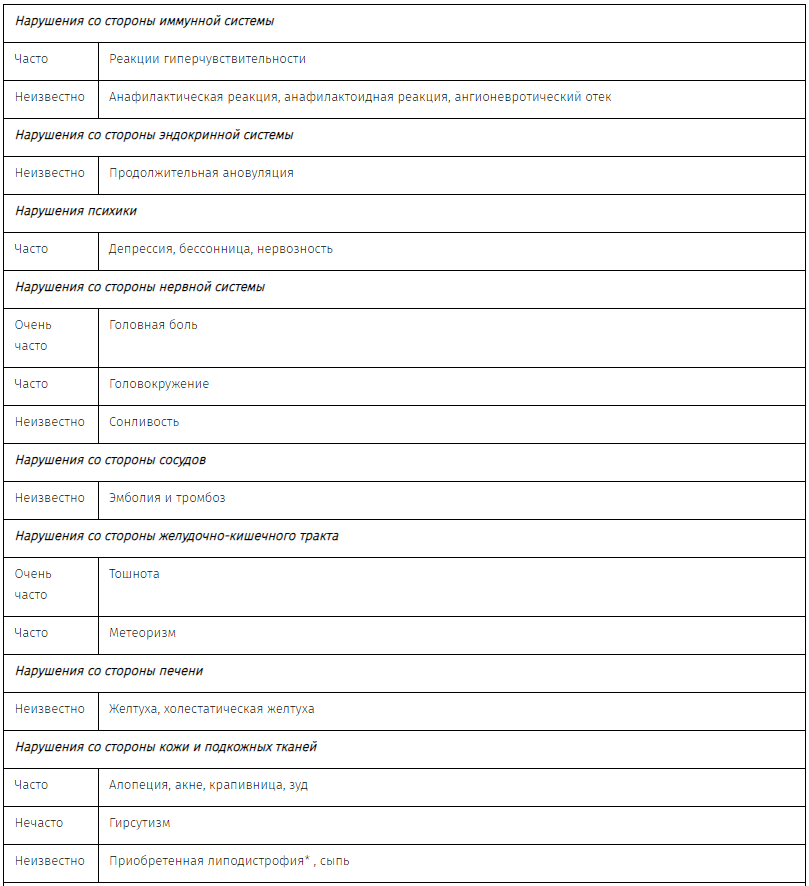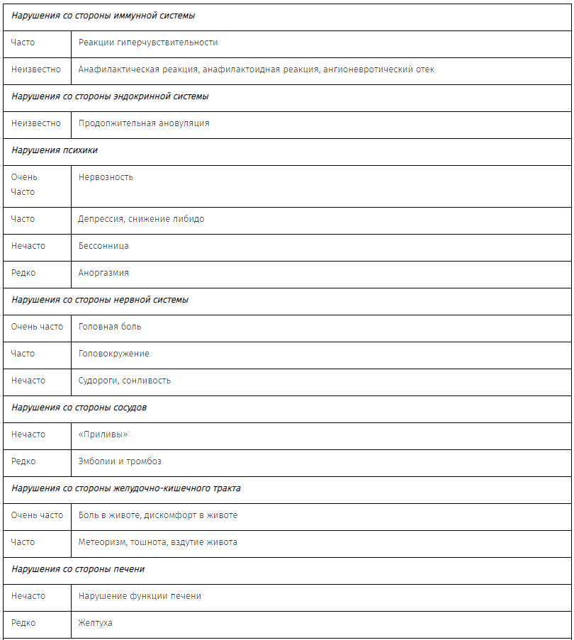 Наиболее часто встречавшиеся побочные реакции (> 5%): дисфункциональные маточные кровотечения (19%), головная боль (12%), маточные кровотечения (10%), тошнота (10%) и боль в суставах (6%):