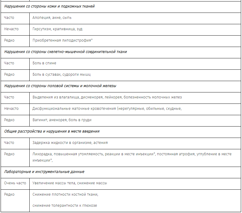 Наиболее часто встречавшиеся нежелательные реакции (> 5%): увеличение массы тела (69%), снижение массы тела (25%), головная боль (16%), нервозность (11%), боль или дискомфорт в животе (11%), головокружение (6%), снижение либидо (6%).