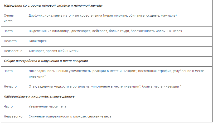 У большинства женщин при применении препарата ДЕПО-ПРОВЕРА® (как после однократного, так и после многократного введения препарата) возможны продолжительная ановуляция с аменореей и нарушения менструального цикла (например, ациклические кровотечения/кровомазания, редкие, обильные или продолжительные кровотечения). Если пациентки продолжают применять препарат, то частота нерегулярных кровотечений уменьшается, а частота развития аменореи увеличивается.
