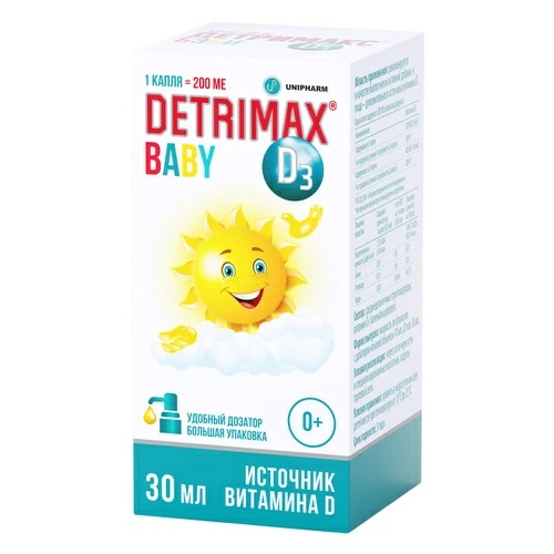 Детримакс® Бэби содержит витамин D3 (колекальциферол) - жизненно важный жирорастворимый витамин, необходимый для обеспечения деятельности практически всех органов и систем человеческого организма.