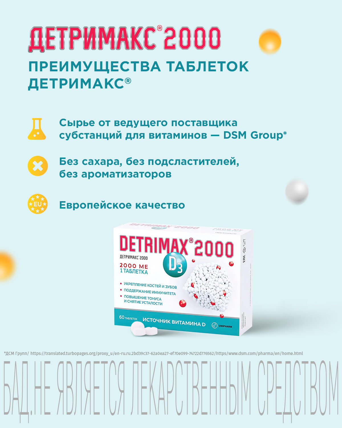 Детримакс® 2000 содержит витамин D3 (колекальциферол) - жизненно важный жирорастворимый витамин, необходимый для обеспечения деятельности практически всех органов и систем человеческого организма.