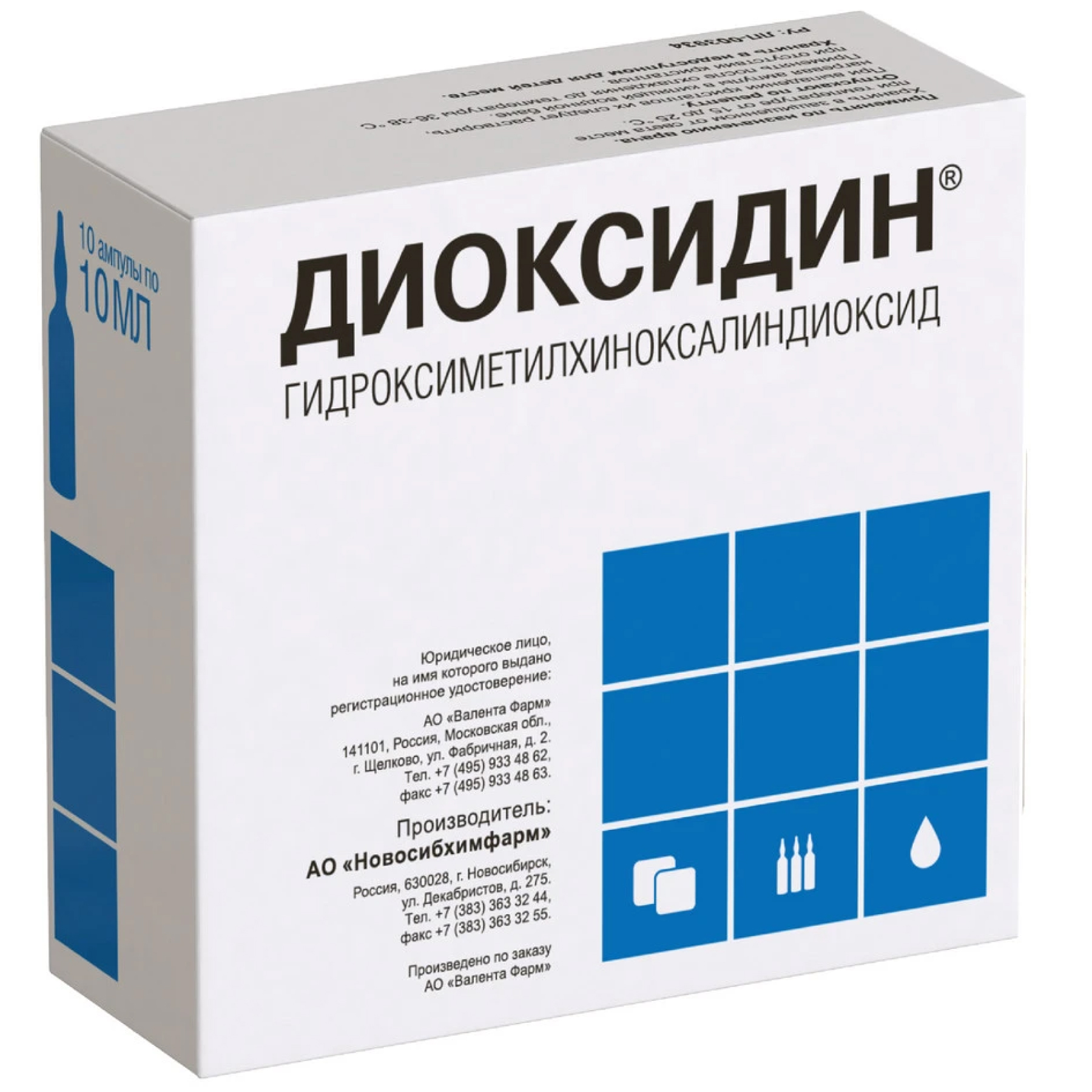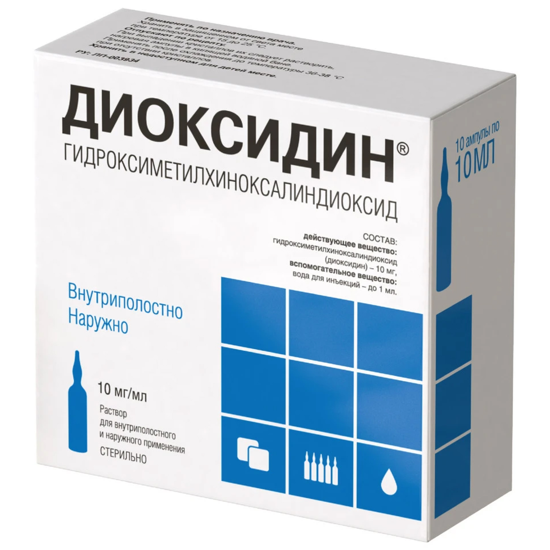 Активное вещество: гидроксиметилхиноксалиндиоксид (диоксидин) -10 мг