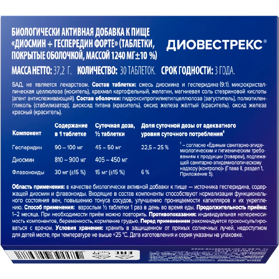Смесь диосмина и гесперидина (9:1), носитель - микрокристаллическая целлюлоза, оболочка (загуститель – гидроксипропилметилцеллюлоза, стабилизатор – полиэтиленгликоль, красители: диоксид титана, оксид железа желтый, оксид железа красный), крахмал картофельный, желатин, агент антислеживающий – магниевая соль стеариновой кислоты.