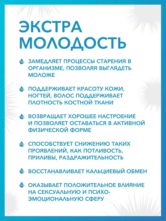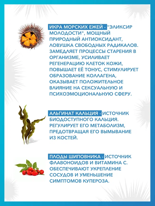 В состав комплекса ЭКСТРА МОЛОДОСТЬ входят полностью натуральные компоненты: икра морских ежей, альгинат кальция и плоды шиповника.