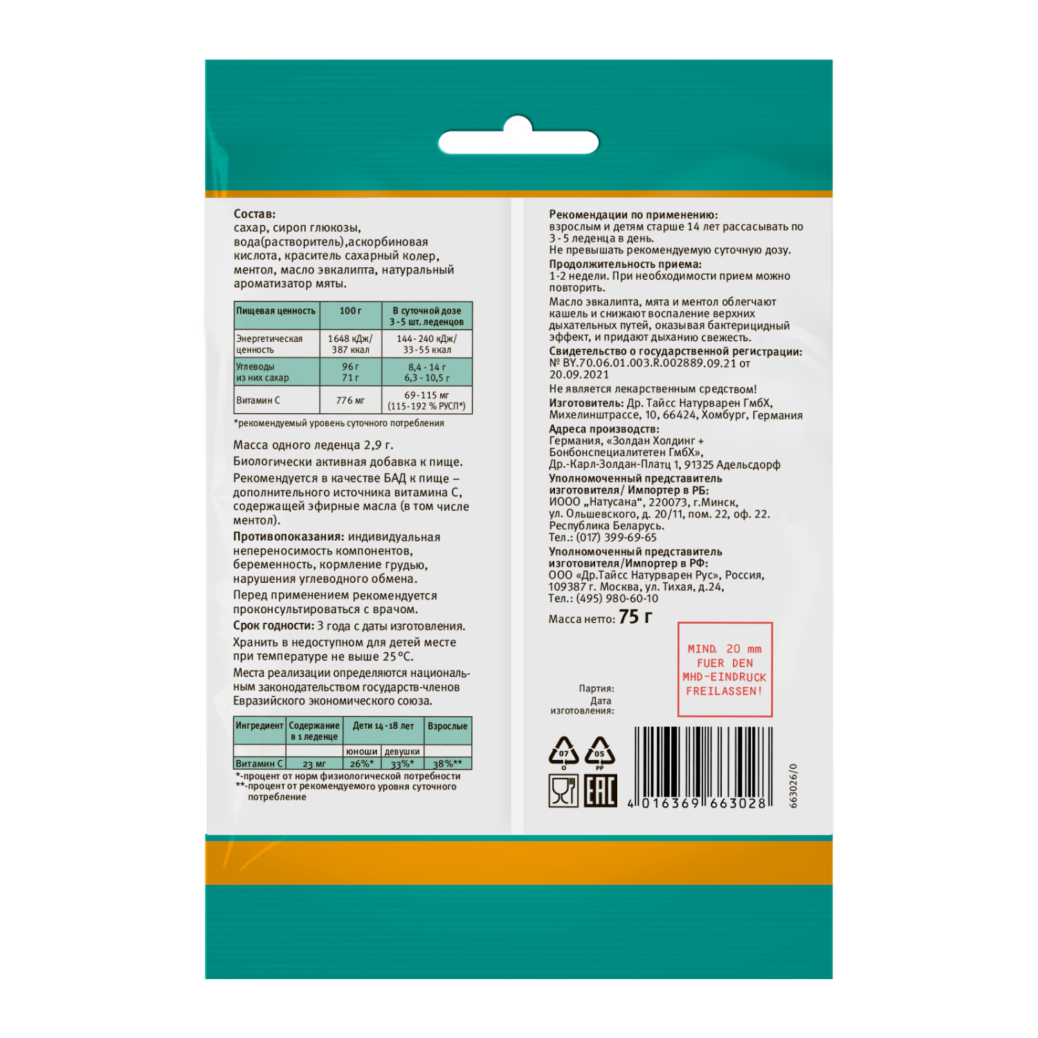 Эвкалиптовое масло и ментол обладают бактерицидным действием, смягчают кашель и раздражение верхних дыхательных путей, освежают и придают дыханию длительную свежесть. Рекомендуются в качестве источника витамина С и эфирных масел.