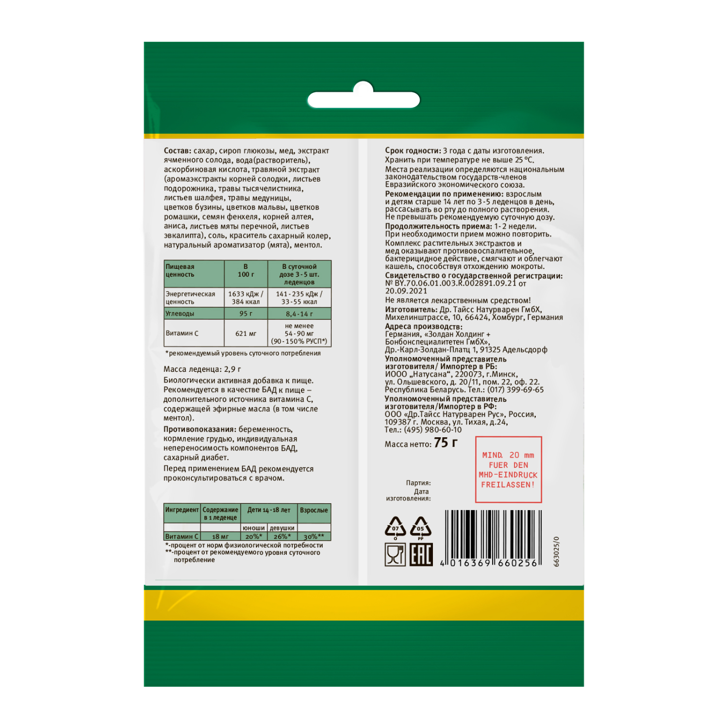Сахар, сироп глюкозы, мед, экстракт ячменного солода, вода(растворитель), аскорбиновая кислота, травяной экстракт (аромаэкстракты корней солодки, листьев подорожника, травы тысячелистника, листьев шалфея, травы медуницы, цветков бузины, цветков мальвы, цветков ромашки, семян фенхеля, корней алтея, аниса, листьев мяты перечной, листьев эвкалипта), соль, краситель сахарный колер, натуральный ароматизатор (мята), ментол.