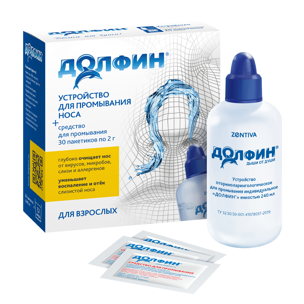 Долфин — минерально-растительный комплекс, который разработан специально для промывания носовой полости в домашних условиях. Процесс промывания безболезнен и проводится быстро. Разрешен для применения детям и беременным женщинам.