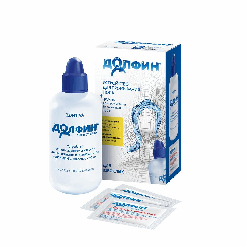 Долфин — минерально-растительный комплекс, который разработан специально для промывания носовой полости в домашних условиях. Процесс промывания безболезнен и проводится быстро. Разрешен для применения детям и беременным женщинам.
