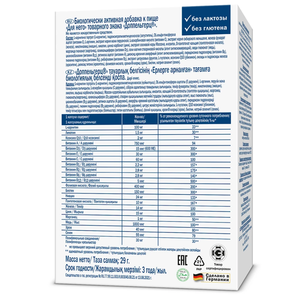 Дополнительный источник витаминов А, D3, Е, С, В1, В2, В6, В12, фолиевой кислоты, биотина, ниацина, пантотеновой кислоты и минеральных веществ – железа, цинка, марганца, меди, хрома, селена, источник L-карнитина и ликопина.