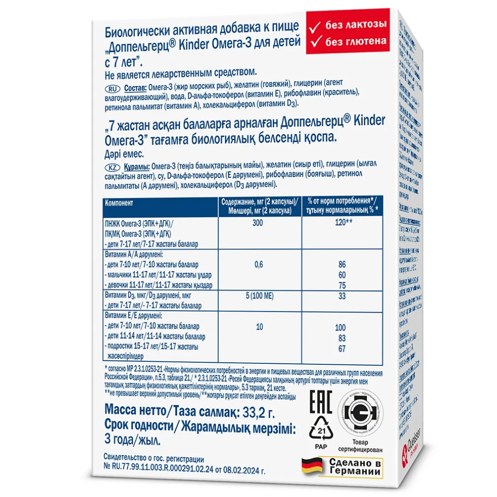 Дополнительный источник ПНЖК Омега-3 (эйкозапентаеновой и докозагексаеновой кислот), витаминов А, D и Е.