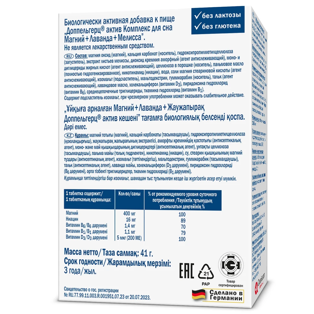 Магния оксид (магний), кальция карбонат (носитель), гидроксипропилметилцеллюлоза (загуститель), экстракт листьев мелиссы, диоксид кремния аморфный (агент антислеживающий), моно- и диглицериды жирных кислот (агент антислеживающий), целлюлоза в порошке (носитель), пальмовое масло (полностью гидрогенизированное), никотинамид (ниацин), вода, соли магния стеариновой кислоты (агент антислеживающий), изомальт (подсластитель), мальтодекстрин, гуммиарабик (носитель), тальк (агент антислеживающий), лавандовое масло, холекальциферол (витамин D3), пиридоксина гидрохлорид (витамин В6), среднецепочечные триглицериды, тиамина гидрохлорид (витамин В1).