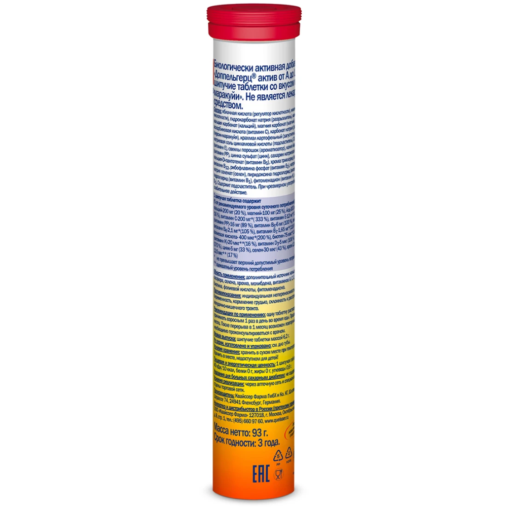 Яблочная кислота (регулятор кислотности Е 296), лимонная кислота (регулятор кислотности Е 330), гидрокарбонат натрия (разрыхлитель Е 500ii), калия глицерофосфат (фосфор), кальция карбонат (кальций), магния карбонат (магний), сорбит (подсластитель 420i), аскорбиновая кислота (витамин С), карбонат натрия (разрыхлитель Е 500i), ароматизатор (персик-маракуйя), крахмал картофельный (загуститель), фолиевая кислота, натриевая соль цикламовой кислоты (подсластитель Е 952), DL-альфа-токоферол ацетат (витамин Е), свеклы порошок (ароматизатор), калия йодат (йод), никотинамид (витамин РР), цинка сульфат (цинк), сахарин натриевая соль (подсластитель Е 954), биотин, кальция-D-пантотенат (витамин В5), хрома трихлорид (хром), витамин А-ацетат, витамин В12, рибофлавина фосфат (витамин В2), натрия молибдат (молибден), натрия селенат (селен), пиридоксина гидрохлорид (витамин В6), тиамина гидрохлорид (витамин В1), фитоменадион (витамин К), холекальциферол (витамин D3).