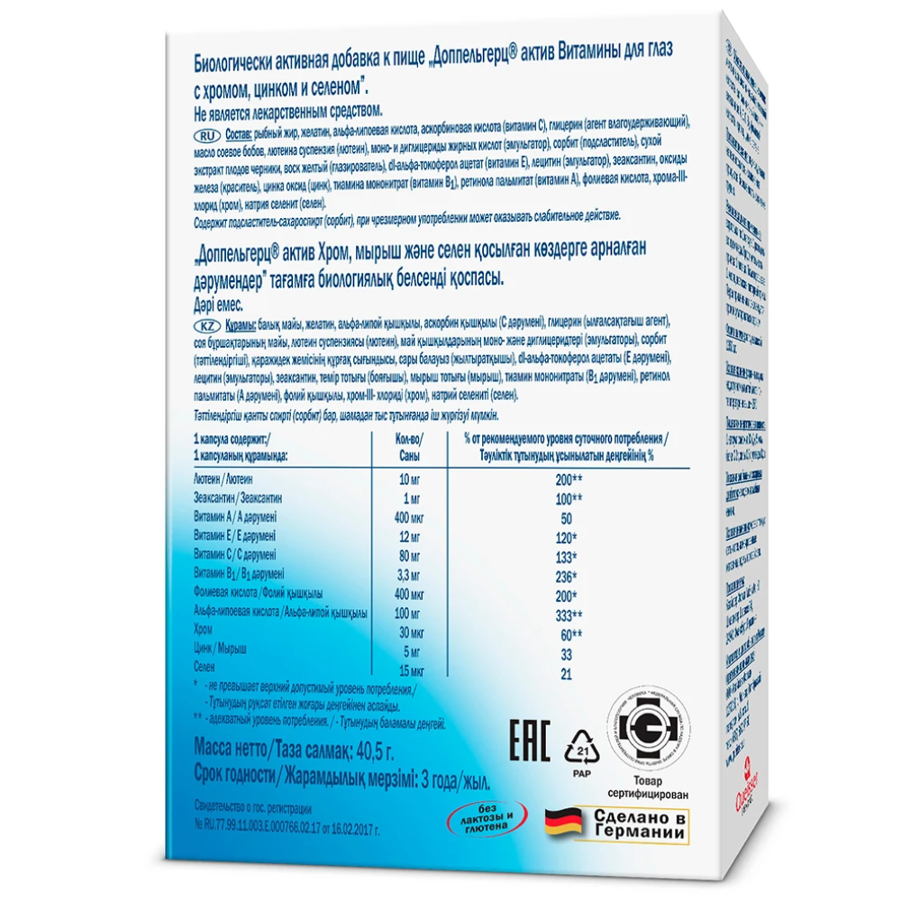 Хром участвует в процессе регулирования внутриглазного давления и, в сочетании с витамином С, стимулирует транспортировку глюкозы к кристаллику глаза.