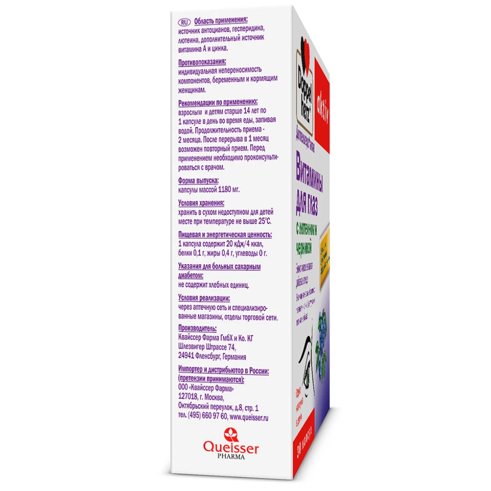 Доппельгерц® актив Витамины для глаз с лютеином и черникой содержит антоцианозиды. Это сильнейшие растительные антиоксиданты черники, которые защищают сосуды от свободных радикалов, улучшают капиллярный кровоток в сетчатке, укрепляют сосуды. И, что очень важно, ускоряют процессы регенерации родопсина – светочувствительного пигмента сетчатки, который страдает от воздействия ярких экранов гаджетов и ультрафиолета.