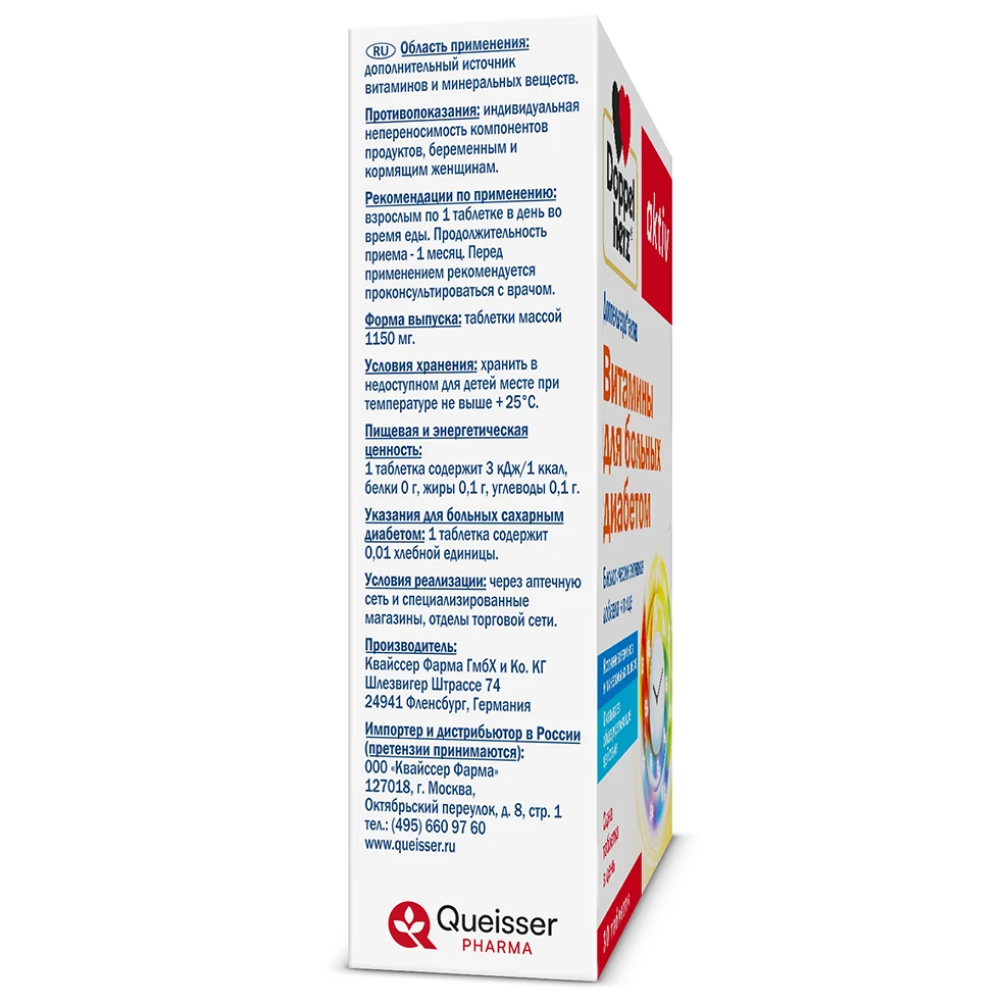 Принимая данный комплекс, восполняющий повышенную потребность в витаминах, микроэлементах и минеральных веществах у больных сахарным диабетом, необходимо помнить, что это не заменяет основную программу лечения сахарного диабета, а лишь дополняет ее. Помимо комплекса витаминов, каждому больному сахарным диабетом врач должен рекомендовать основные правила питания в сочетании с надлежащим образом жизни, достаточную физическую активность, контроль за весом и прием лекарственных препаратов.