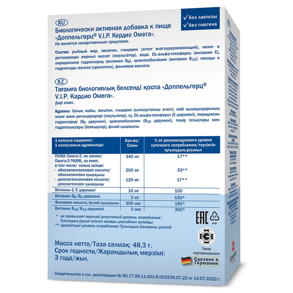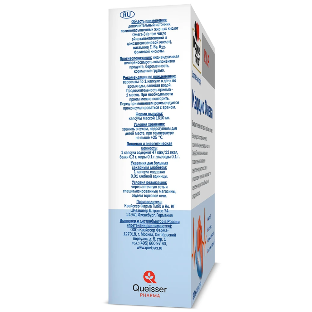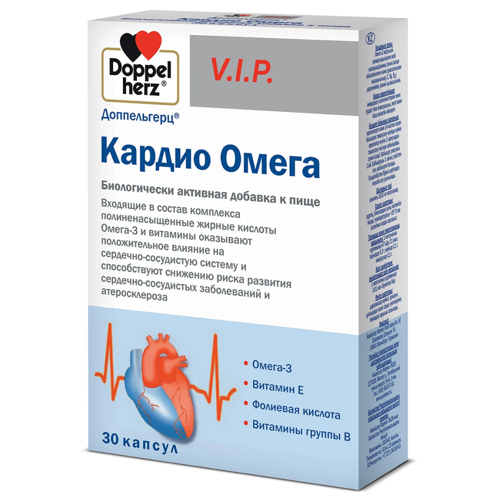 Входящие в состав Доппельгерц V.I.P. Кардио Омега полиненасыщенные жирные кислоты Омега-3 и витамины оказывают положительное влияние на сердечно-сосудистую систему и способствуют снижению риска развития сердечно-сосудистых заболеваний и атеросклероза.