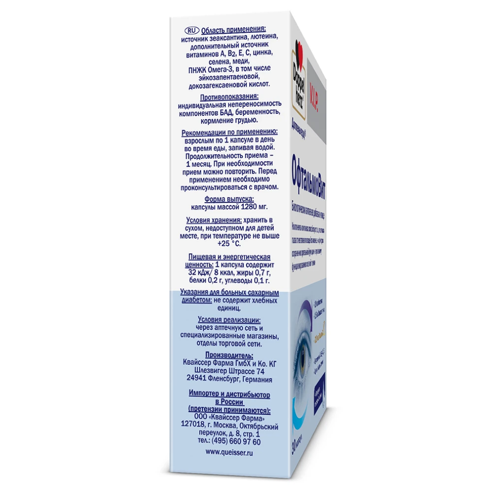 источник зеаксантина, лютеина, дополнительный источник витаминов А, В2, Е, С, цинка, селена, меди, ПНЖК Омега-3, в том числе эйкозапентаеновой, докозагексаеновой кислот.