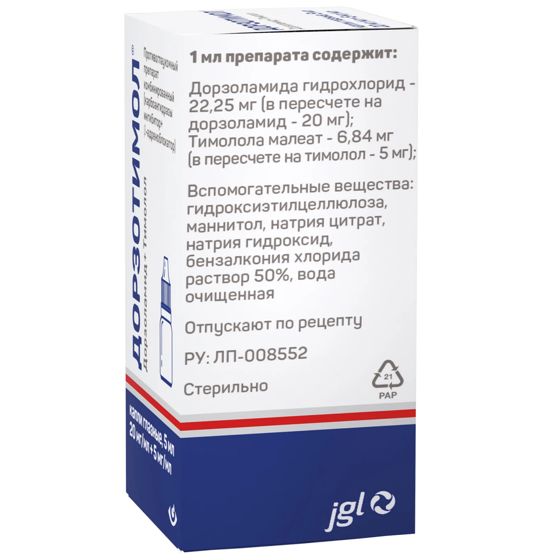 Каждый мл раствора содержит 22,25 мг дорзоламида гидрохлорида (в пересчете на дорзоламид - 20,0 мг) и 6,84 мг тимолола малеата (в пересчете на тимолол - 5,0 мг).