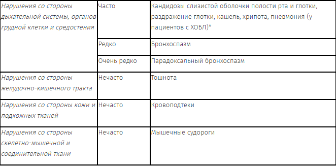 На фоне совместного назначения двух препаратов не было отмечено увеличения частоты возникновения побочных реакций. Наиболее частыми побочными реакциями, связанными с приемом препарата, являются такие фармакологически ожидаемые для бета2-адреномиметиков нежелательные побочные явления, как тремор и учащенное сердцебиение. Симптомы обычно имеют умеренную степень выраженности и проходят через несколько дней после начала лечения. В течение 3-летнего клинического исследования применения будесонида при ХОБЛ кровоподтеки на коже и пневмония встречались с частотой 10% и 6% соответственно, в то время как в плацебо-группе - с частотой 4% и 3% (р<0.001 и р<0.01 соответственно).