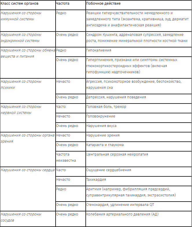 Системное действие может проявиться при приеме любых ингаляционных ГКС, особенно при приеме препаратов в высоких дозах в течение длительного периода времени. Проявление системного действия менее вероятно при проведении ингаляционной терапии, чем при использовании пероральных ГКС. К возможным системным эффектам относятся подавление функции надпочечников, снижение минеральной плотности костной ткани, катаракта и глаукома.