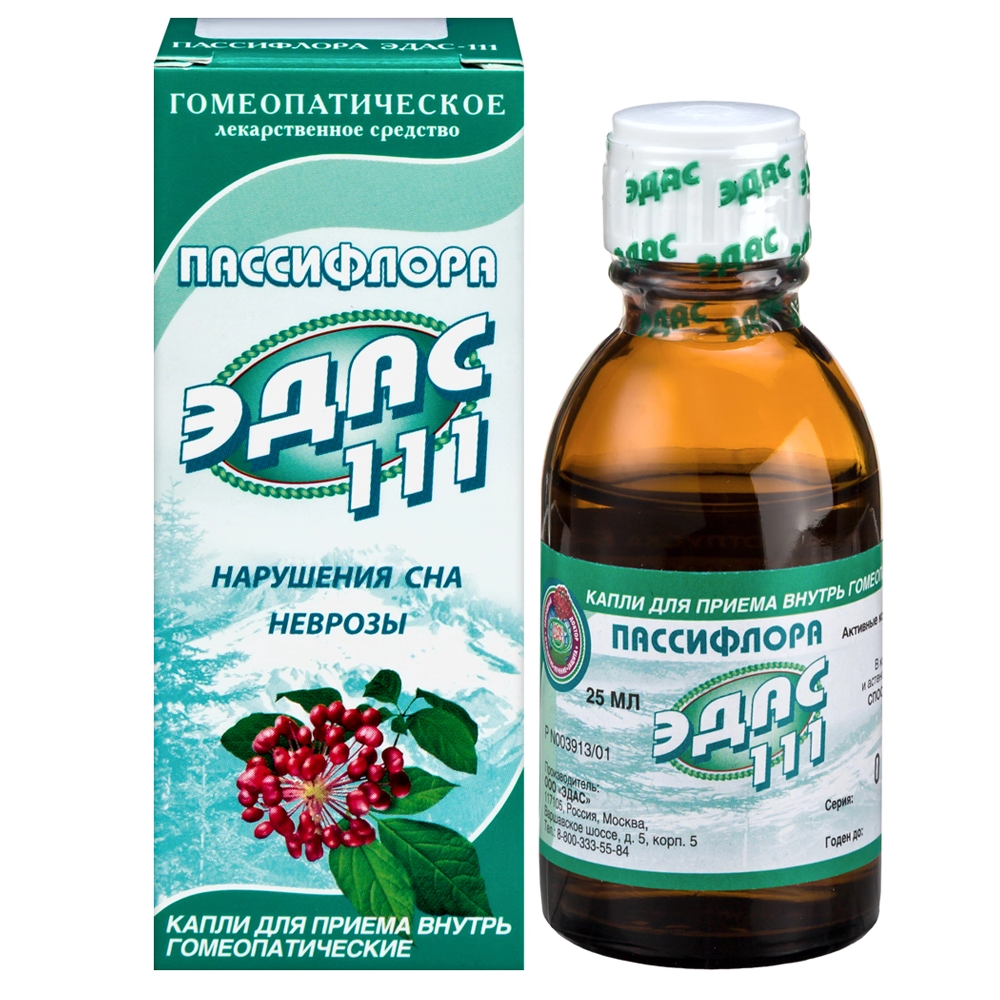 В составе Эдас-111 (Пассифлора) коффея арабика, чилибуха игнация и пассифлора в гомеопатических разведениях.