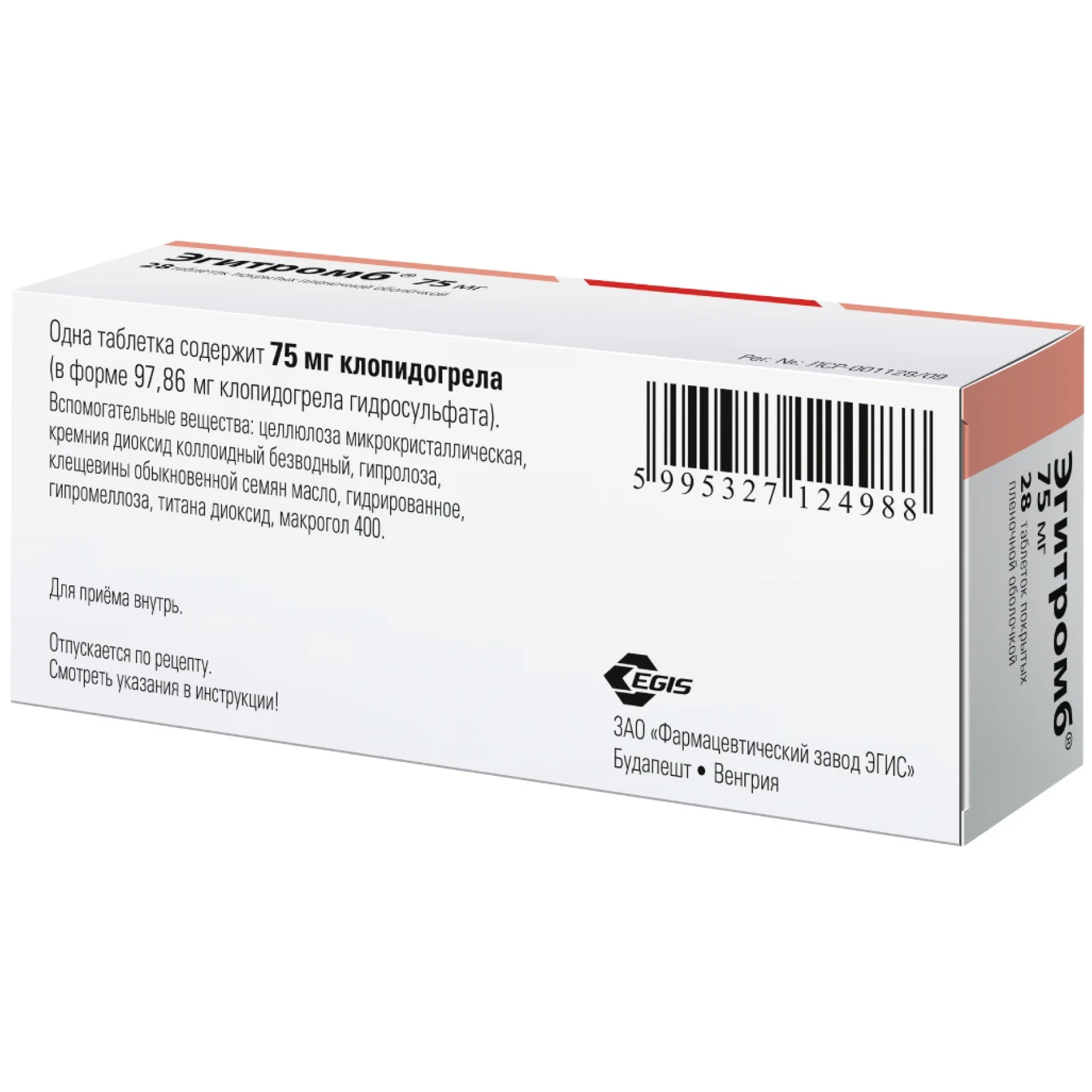 При остром инфаркте миокарда с подъемом сегмента ST Эгитромб® следует принимать в дозе 75 мг 1 раз/сут. Лечение следует начинать с нагрузочной дозы и сочетать с приемом ацетилсалициловой кислоты и тромболитиков или без тромболитиков. Эффективность терапии продолжительностью более 4 недель не изучалась.