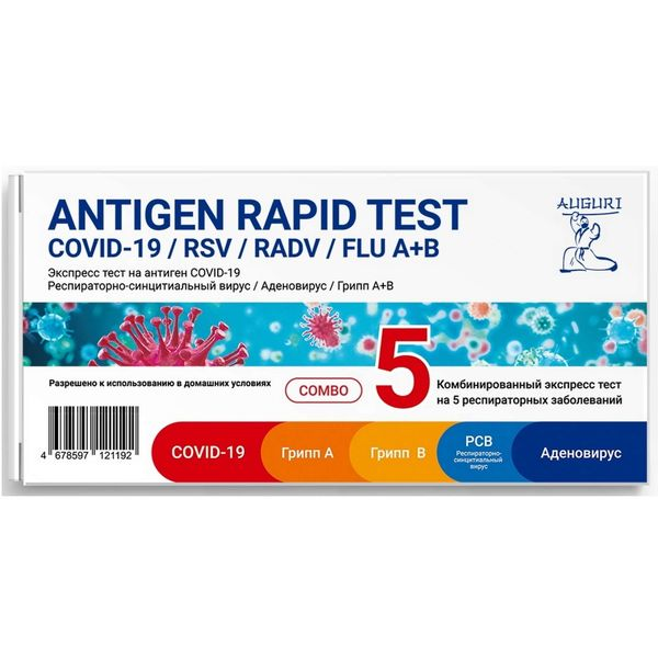 Комбинированный экспресс-тест на антиген COVID-19 / Респираторно-синцитиальный вирус / Аденовируса/ Грипп A/B представляет собой выявления антигена SARS-CoV-2, Респираторно-синцитиального вируса, Аденовируса, Грипп A и Грипп В, в биологическом материале человека (мазок из носа и носоглотки) хроматографический иммуноанализ для качественного определения.