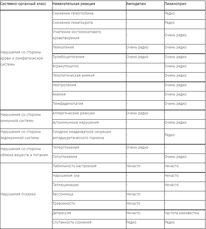 Частота нежелательных реакций приведена отдельно для лизиноприла и амлодипина. Ниже представлены нежелательные лекарственные реакции (НЛР), зарегистрированные во время раздельного применения амлодипина и лизиноприла.