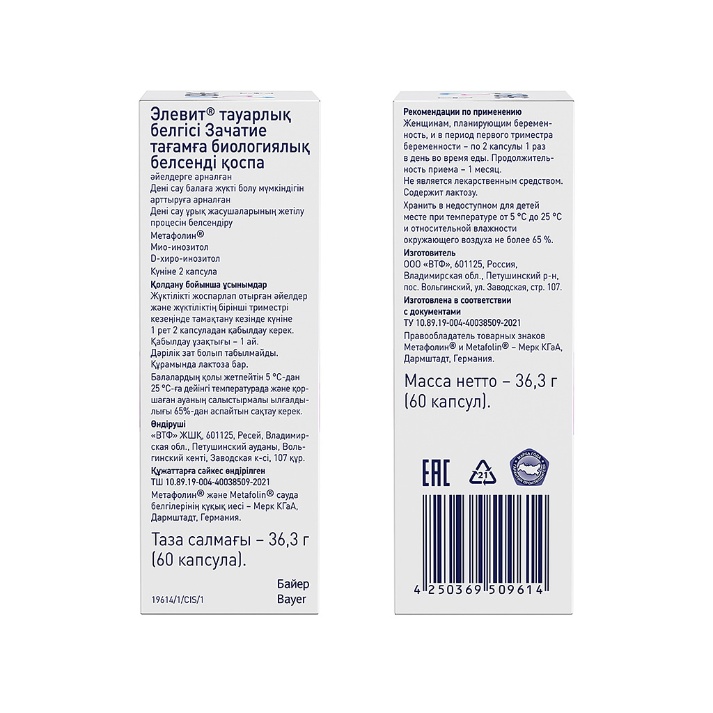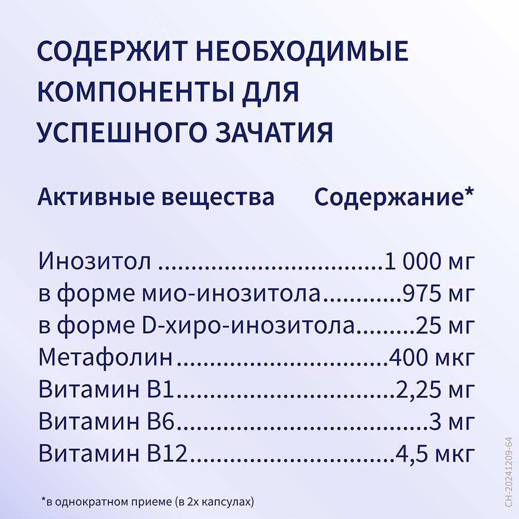 Инозит (в форме мио-инозитола и D-хиро-инозитола), капсула желатиновая (желатин, краситель диоксид титана), агенты антислеживающие: диоксид кремния аморфный и магниевая соль стеариновой кислоты, пиридоксина гидрохлорид, тиамина гидрохлорид, лактоза, кальция L-метилфолат, цианокобаламин. Пищевая ценность (2 капсулы): углеводы – 0,0016 г, белки – 0,19 г. Энергетическая ценность (2 капсулы): 3,256 кДж/ 0,766 ккал.